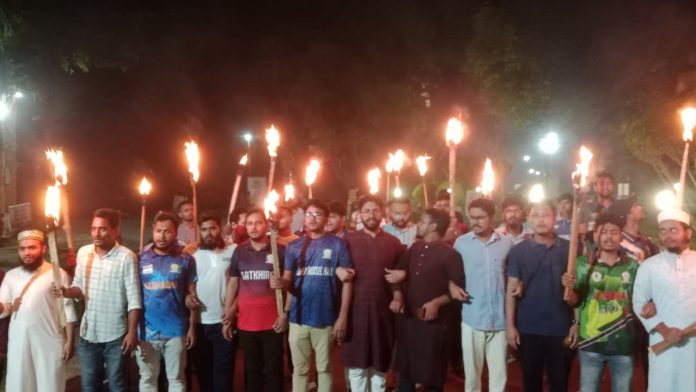শুক্রবার (১৭ অক্টোবর) রাত আটটার দিকে ক্যাম্পাসের জিয়া মোড় থেকে মশাল মিছিল বের করেন। পরে এটি ক্যাম্পাসের গুরুত্বপূর্ণ সড়ক প্রদক্ষিণ করে বিশ্ববিদ্যালয়ের প্রধান ফটকের সামনে সংক্ষিপ্ত সমাবেশের মাধ্যমে শেষ হয়।