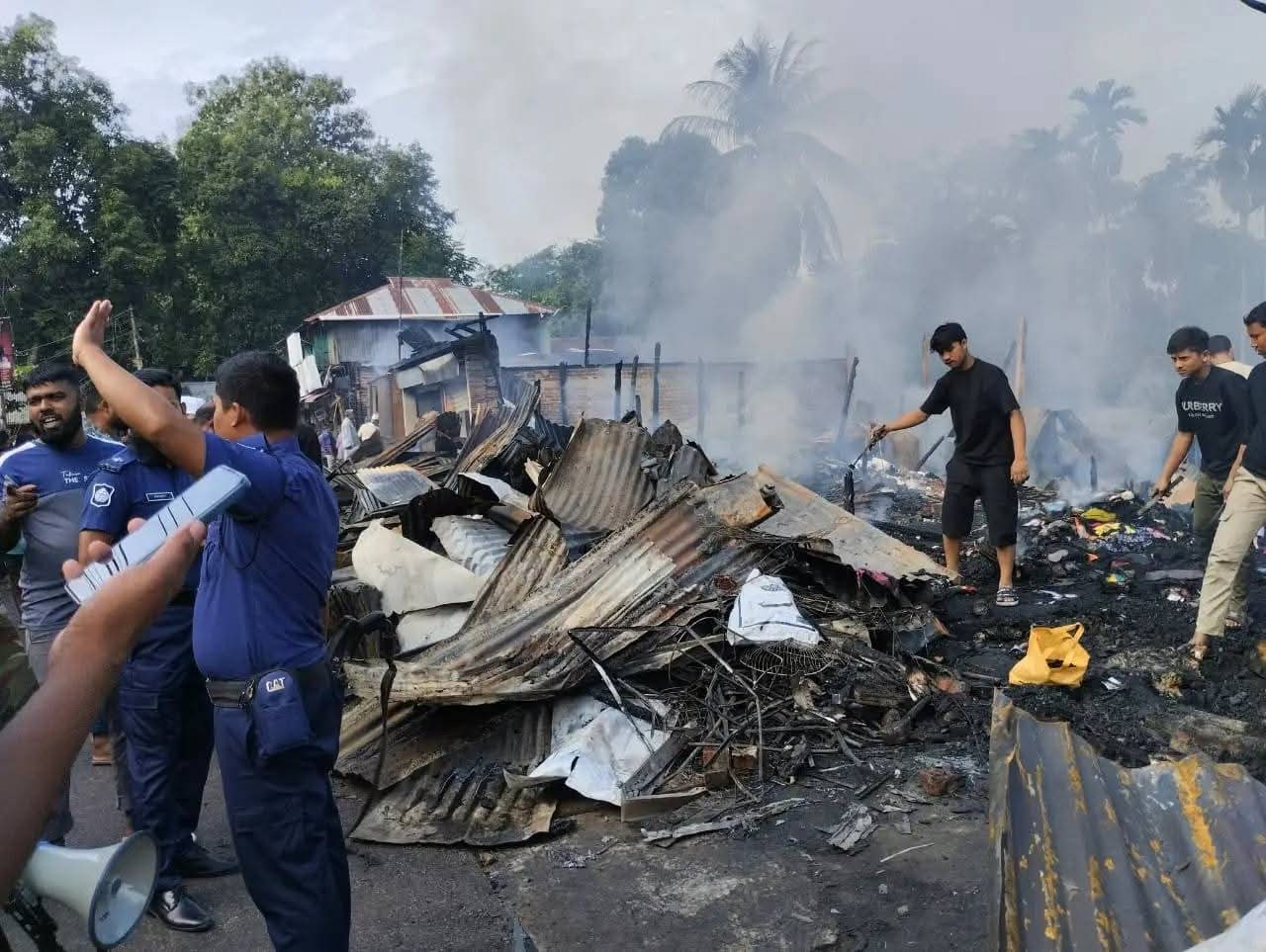 প্রত্যক্ষদর্শীরা জানান, বাজার মসজিদের সামনে অবস্থিত একটি দোকান থেকে আগুনের সূত্রপাত হয়, যা মুহূর্তের মধ্যে আশপাশের দোকানগুলোতে ছড়িয়ে পড়ে। পানির সংকটে ফায়ার সার্ভিস অসহায় হয়ে পড়ে এবং পরিস্থিতি নিয়ন্ত্রণে আনতে সবাই বৃষ্টির ওপর নির্ভর করেন।