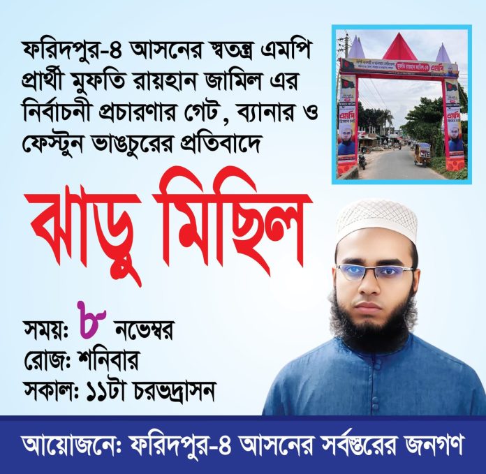 ফরিদপুর-৪ আসনের স্বতন্ত্র সংসদ সদস্য প্রার্থী মুফতি রায়হান জামিল ঘোষণা দিয়েছেন যে আগামীকাল শনিবার (৮ নভেম্বর) সকাল ১১টায় চরভদ্রাসন উপজেলা সদরে একটি বৃহৎ “ঝাড়ু মিছিল” অনুষ্ঠিত হবে। ফেসবুকে দেওয়া এক পোস্টে তিনি জানিয়েছেন, নির্বাচনী গেট, ব্যানার ও ফেস্টুন ভাঙচুরের প্রতিবাদেই এই শান্তিপূর্ণ কর্মসূচির আয়োজন করা হয়েছে।