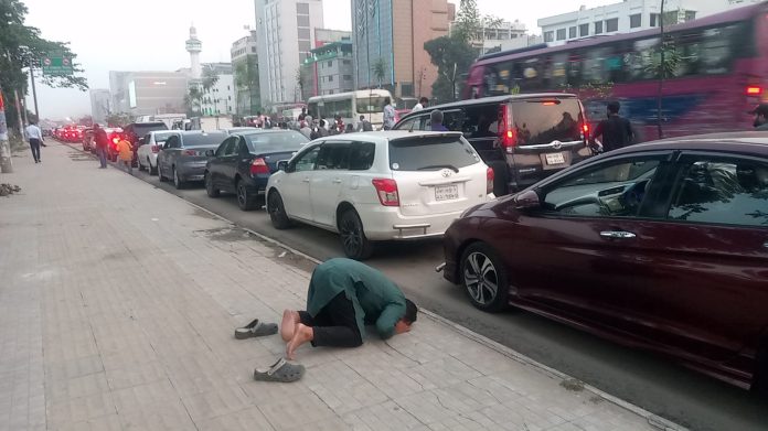 দীর্ঘ সময় অপেক্ষার মধ্যেই আসরের নামাজের সময় হলে এক মুসল্লি গাড়ি থেকে নেমে রাস্তায় নামাজ আদায় করেন।