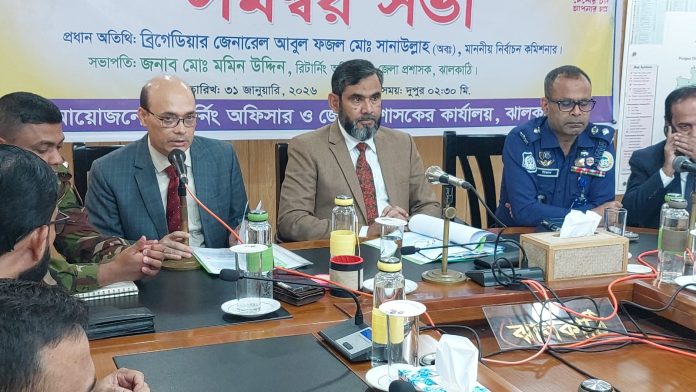 ত্রয়োদশ জাতীয় সংসদ নির্বাচন ও গণভোটকে সামনে রেখে ঝালকাঠি জেলায় আইনশৃঙ্খলা পরিস্থিতি স্বাভাবিক রাখতে জেলা প্রশাসনের আয়োজনে একটি সমন্বয় সভা অনুষ্ঠিত হয়। সভায় নির্বাচন কমিশনার ব্রিগেডিয়ার জেনারেল (অব.) আবুল ফজল মো. সানাউল্লাহ আইনশৃঙ্খলা বাহিনী ও নির্বাচন সংশ্লিষ্ট কর্মকর্তাদের করণীয় সম্পর্কে বিস্তারিত ও স্পষ্ট দিকনির্দেশনা দেন।