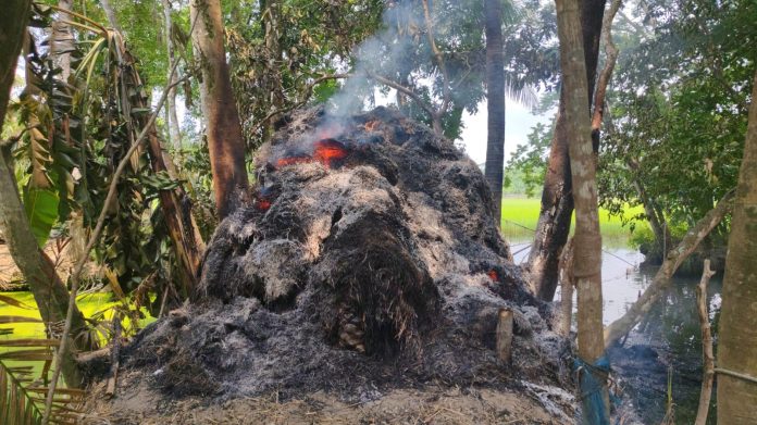 ক্ষতিগ্রস্ত হানিফ হাওলাদার দাবি করেন, জমি বিরোধের জের ধরে প্রতিপক্ষের লোকজন পরিকল্পিতভাবে এ ঘটনা ঘটিয়েছে। তিনি অভিযোগ করেন, আজগর আলীর স্ত্রী হালিমা বেগম, মেয়ে মিনা বেগম ও পুত্রবধূ পরশ মনি সহ কয়েকজন মিলে শনিবার রাত আনুমানিক ৯টার দিকে তার গরুর খাদ্যে আগুন দেয়। এছাড়া তার গরু চুরি করে নিয়ে যাওয়ার চেষ্টা করা হলে এলাকাবাসী তা উদ্ধার করে।