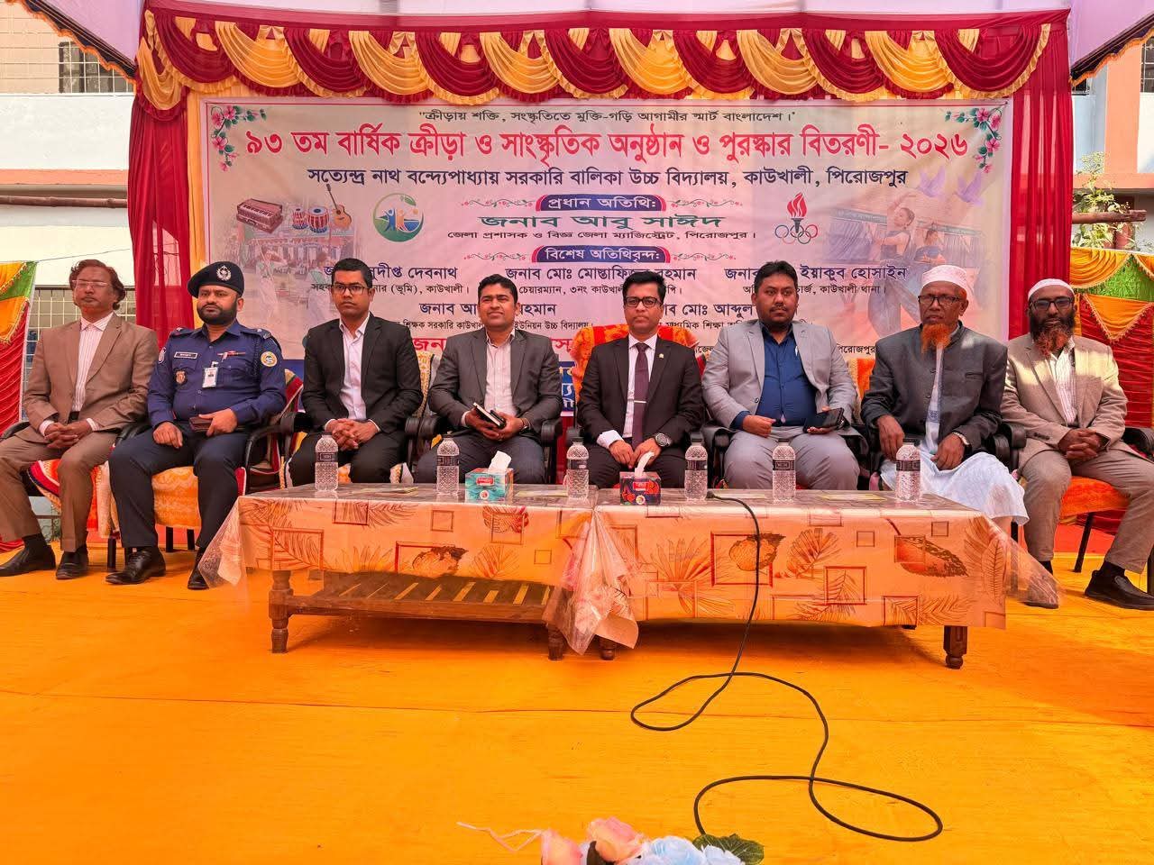 পিরোজপুরের কাউখালী উপজেলার ঐতিহ্যবাহী সত্যেন্দ্র নাথ বন্দ্যোপাধ্যায় সরকারি বালিকা উচ্চ বিদ্যালয়ে বর্ণাঢ্য আয়োজনে অনুষ্ঠিত হয়েছে বার্ষিক ক্রীড়া, সাংস্কৃতিক অনুষ্ঠান ও পুরস্কার বিতরণী–২০২৬। মঙ্গলবার (২৭ জানুয়ারি) দিনব্যাপী বিদ্যালয় প্রাঙ্গণে উৎসবমুখর পরিবেশে এ আয়োজন সম্পন্ন হয়।