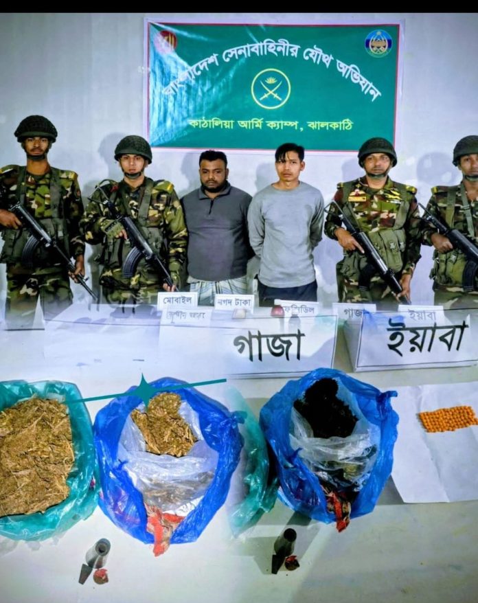 ঝালকাঠির কাঠালিয়া উপজেলার শৌলজালিয়া ইউনিয়নের দোগানা বাজার থেকে মঙ্গলবার (২৭ জানুয়ারি) সেনাবাহিনীর একটি টিম বিপুল পরিমাণ মাদক ও দেশীয় অস্ত্রসহ ২ মাদক ব্যবসায়ীকে আটক করেছে।