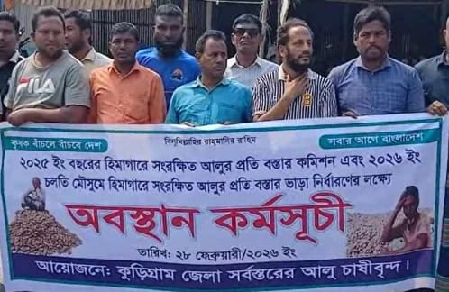 কুড়িগ্রামে আলুচাষী ও ব্যবসায়ীরা হিমাগারে সংরক্ষিত আলুর বস্তা প্রতি কমিশন এবং ২০২৬ সালে আলুর বস্তার ভাড়া নির্ধারণের দাবিতে মানববন্ধন ও প্রতিবাদ সমাবেশ করেছে।