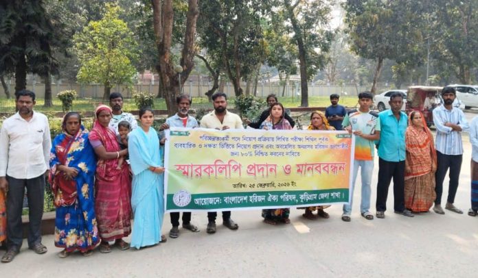 কুড়িগ্রামে জেলা প্রশাসকের কার্যালয়ে পরিচ্ছন্নতাকর্মী পদে নিয়োগ প্রক্রিয়ায় লিখিত পরীক্ষা শিথিল করে ব্যবহারিক ও দক্ষতার ভিত্তিতে নিয়োগ প্রদান এবং অবহেলিত অনগ্রসর হরিজন জনগোষ্ঠীর জন্য ৮০ শতাংশ পদ সংরক্ষণের দাবিতে মানববন্ধন ও স্মারকলিপি প্রদান অনুষ্ঠিত হয়েছে।