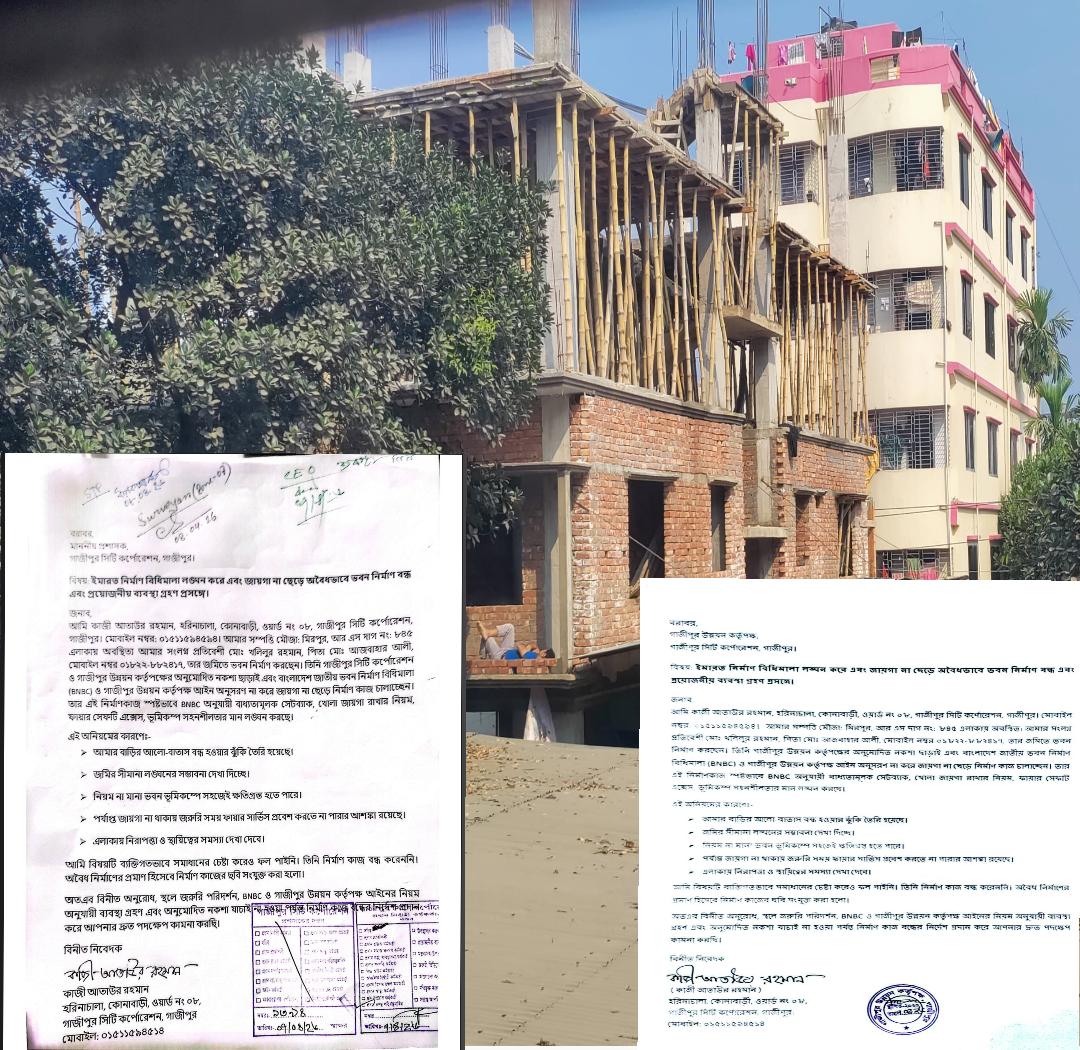 স্থানীয়রা জানান, ভবন মালিক মোঃ খলিলুর রহমান (পিতা: আজবাহার আলী) সংশ্লিষ্ট কর্তৃপক্ষের অনুমোদন ছাড়াই নির্মাণ কাজ চালিয়ে যাচ্ছেন। তিনি গাজীপুর সিটি কর্পোরেশন ও গাজীপুর উন্নয়ন কর্তৃপক্ষ-এর অনুমোদিত নকশা অনুসরণ না করে এবং বাংলাদেশ জাতীয় ভবন নির্মাণ বিধিমালা (BNBC) লঙ্ঘন করে নির্ধারিত জায়গা না ছেড়ে ভবন নির্মাণ করছেন।