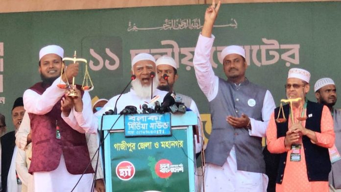 গাজীপুরের ঐতিহাসিক ভাওয়াল রাজবাড়ী মাঠে ১১ দলীয় জোটের উদ্যোগে এক বৃহৎ নির্বাচনী জনসভা অনুষ্ঠিত হয়েছে। লক্ষাধিক মানুষের উপস্থিতিতে আয়োজিত এ জনসভায় প্রধান অতিথির বক্তব্যে বাংলাদেশ জামায়াতে ইসলামীর আমীর ডা. শফিকুর রহমান ন্যায়বিচার, শ্রমিকের অধিকার ও নারীর মর্যাদা নিশ্চিতের অঙ্গীকার পুনর্ব্যক্ত করেন।