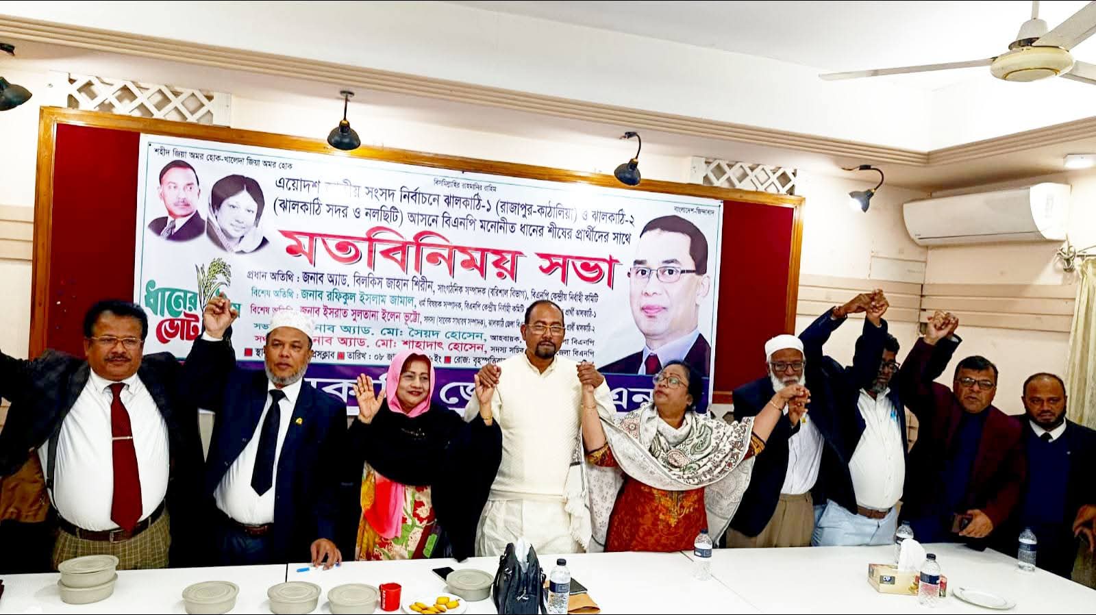 ত্রয়োদশ জাতীয় সংসদ নির্বাচনে ঝালকাঠির দুইটি আসনে বিএনপির মনোনীত প্রার্থীদের সঙ্গে জেলা ও উপজেলার নেতাকর্মীদের মতবিনিময় সভা অনুষ্ঠিত হয়েছে। বৃহস্পতিবার দুপুরে ঝালকাঠি প্রেসক্লাবের কাজী খলিলুর রহমান মিলনায়তনে জেলা বিএনপির আয়োজনে এ সভা অনুষ্ঠিত হয়।
