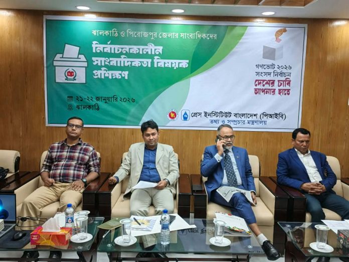 ঝালকাঠি ও পিরোজপুর জেলার সাংবাদিকদের অংশগ্রহণে নির্বাচনকালীন সাংবাদিকতা বিষয়ক দুই দিনব্যাপী প্রশিক্ষণ কর্মশালা শুরু হয়েছে। বৃহস্পতিবার (২১ জানুয়ারি) সকালে ঝালকাঠি সার্কিট হাউজ মিলনায়তনে প্রেস ইনস্টিটিউট বাংলাদেশ (পিআইবি) ও তথ্য ও সম্প্রচার মন্ত্রণালয়ের যৌথ আয়োজনে এই প্রশিক্ষণ কার্যক্রমের উদ্বোধন করা হয়।