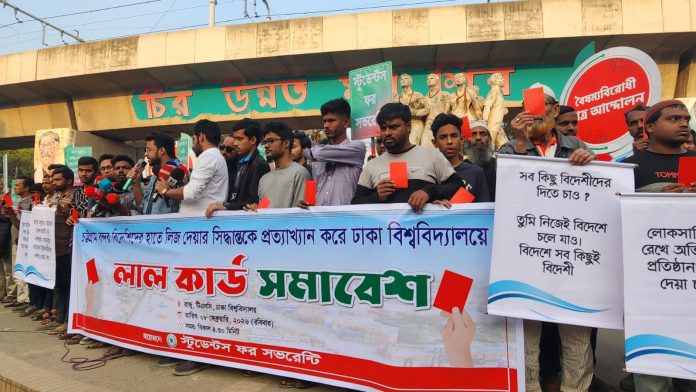 চট্টগ্রাম বন্দরের নিউমুরিং কনটেইনার টার্মিনাল (এনসিটি) বিদেশি প্রতিষ্ঠানকে লিজ দেওয়ার সরকারি সিদ্ধান্ত প্রত্যাখ্যান করে প্রতিবাদ জানিয়েছে সংগঠন ‘স্টুডেন্টস ফর সভরেন্টি’। আজ রোববার (৮ ফেব্রুয়ারি ২০২৬) ঢাকা বিশ্ববিদ্যালয়ের টিএসসি এলাকার রাজু ভাস্কর্যের সামনে ‘লালকার্ড’ কর্মসূচির মাধ্যমে তারা সরকার ও ডিপি ওয়ার্ল্ডের বিরুদ্ধে এই প্রতিবাদ জানায়।