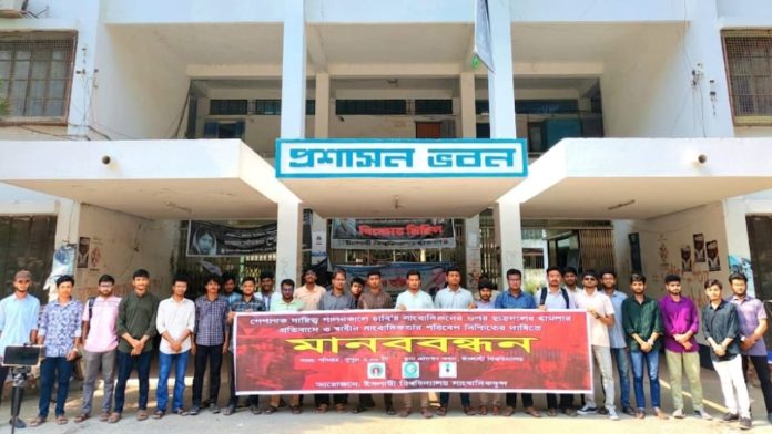 শনিবার (২৫ এপ্রিল) দুপুর ২ টায় প্রশাসন ভবন চত্বরে এ কর্মসূচি পালন করে তারা।এ সময় তারা সাংবাদিকদের উপর হামলায় জড়িতদের শাস্তি ও স্বাধীন সাংবাদিকতার পরিবেশ নিশ্চিতের দাবী জানান।