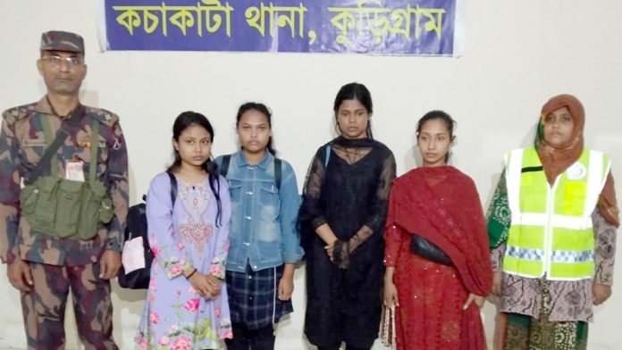 দালালের প্রলোভনে সীমান্ত পেরিয়ে ভারতে যাওয়া চার বাংলাদেশি তরুণীকে আটক করার পর দেশে ফিরিয়ে দিয়েছে ভারতীয় সীমান্তরক্ষী বাহিনী (বিএসএফ)। বুধবার (২৬ নভেম্বর) বিকেল সাড়ে ৫টার দিকে কুড়িগ্রামের নাগেশ্বরী উপজেলার কচাকাটা কেদার সীমান্তে পতাকা বৈঠকের মাধ্যমে তাদেরকে বিজিবির কাছে হস্তান্তর করা হয়।
