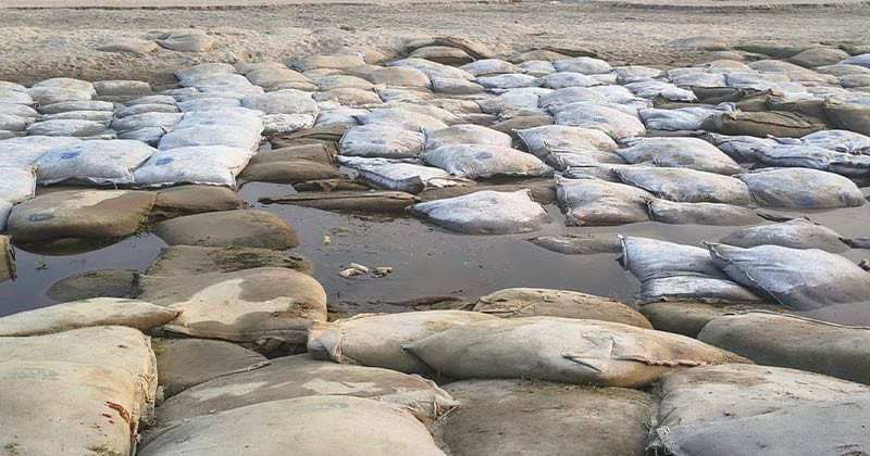 বলদী পাড়া এলাকায় সরেজমিনে দেখা গেছে—নদীর একাধিক স্থানে জিও ব্যাগ স্তূপ হয়ে চর তৈরি করেছে। বর্ষায় যেখানে প্রবল স্রোত থাকার কথা, সেখানে এখন পানিও নেই।