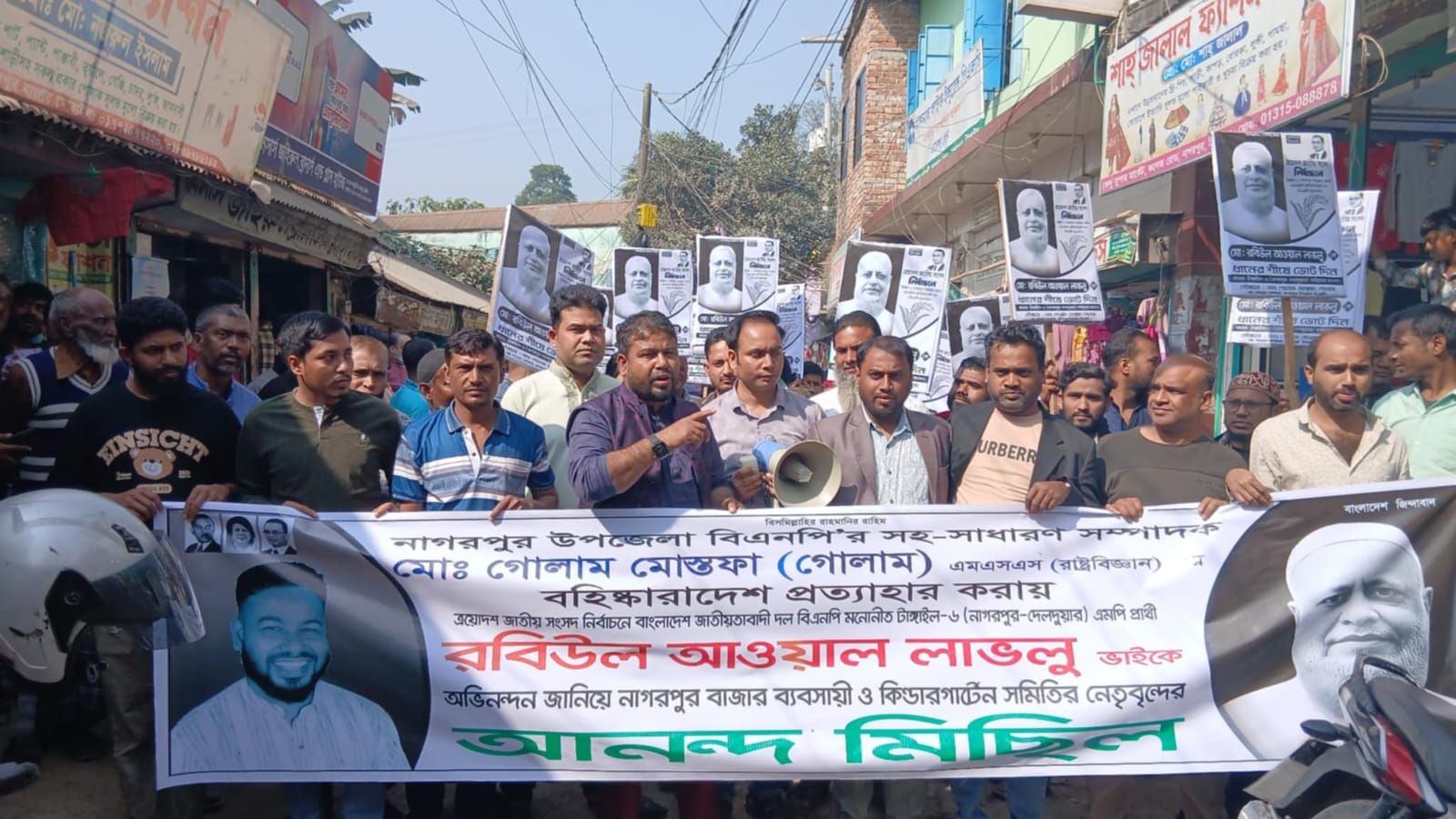 ত্রয়োদশ জাতীয় সংসদ নির্বাচনে টাঙ্গাইল-৬ (নাগরপুর–দেলদুয়ার) আসনে বিএনপি মনোনীত সংসদ সদস্য প্রার্থী রবিউল আওয়াল লাভলুর পক্ষে ধানের শীষ প্রতীকে বিজয় নিশ্চিত করার লক্ষ্যে নাগরপুরে একটি বিশাল নির্বাচনী মিছিল অনুষ্ঠিত হয়েছে।