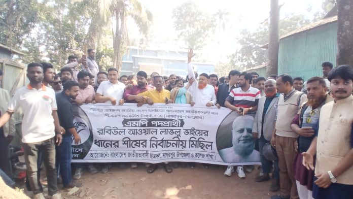 বৃহস্পতিবার দুপুরে রবিউল আওয়াল লাভলুর নিজ বাসভবন থেকে মিছিলটি বের হয়ে উপজেলা চত্বর ও সদর বাজারের গুরুত্বপূর্ণ সড়ক প্রদক্ষিণ করে। নেতাকর্মীদের স্বতঃস্ফূর্ত অংশগ্রহণে প্রচারণা র্যালীটি প্রাণবন্ত হয়ে ওঠে।