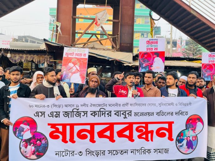 নাটোর-৩ সিংড়া আসনে ১০ দলীয় জোট থেকে এনসিপির প্রার্থী জার্জিস কাদির বাবুকে পরিবর্তনের দাবিতে মানববন্ধন করেছে সচেতন নাগরিকের ব্যানারে শতাধিক মানুষ।