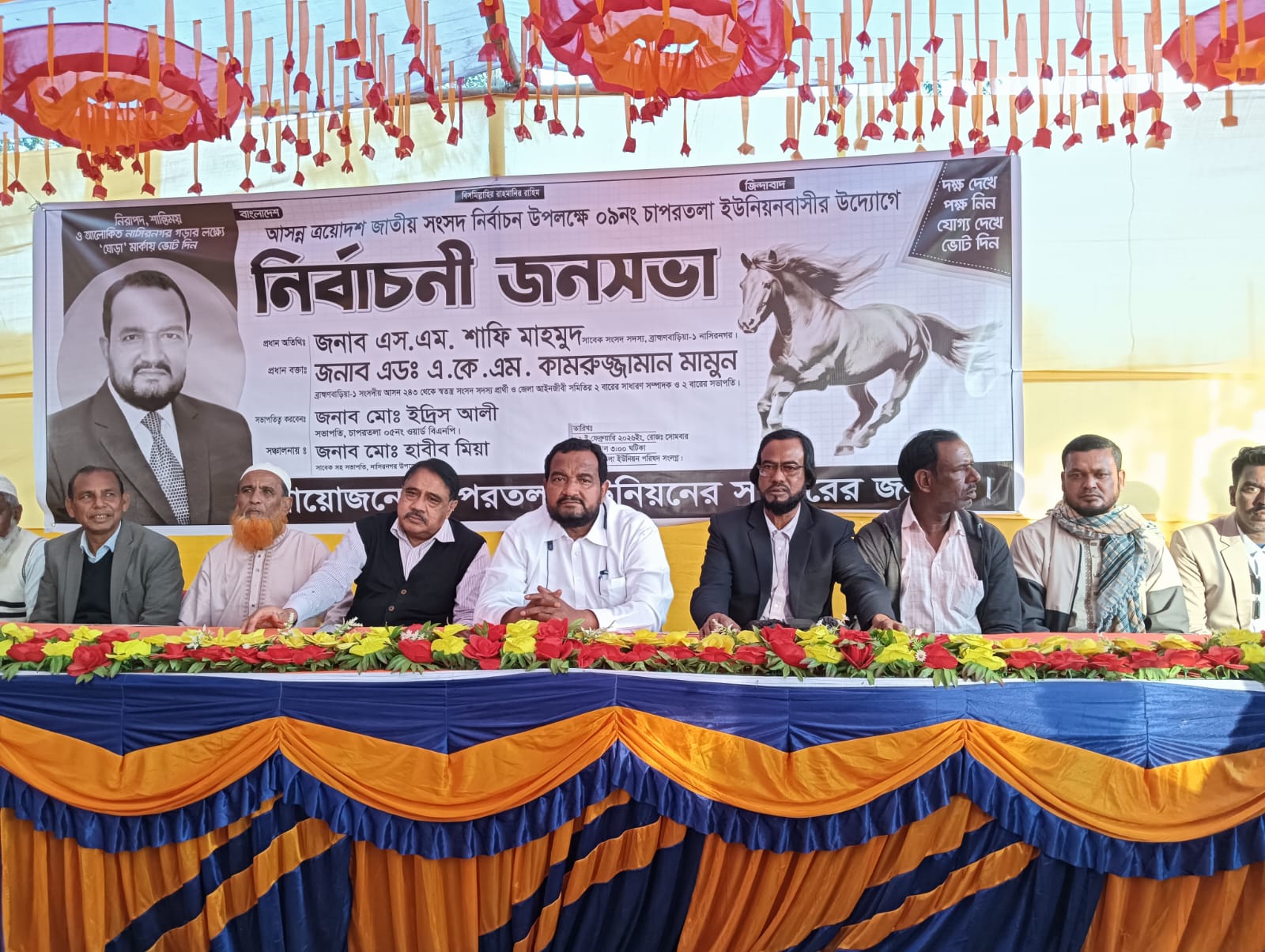 চাপরতলা ইউনিয়ন ৫ নম্বর ওয়ার্ড বিএনপির সভাপতি মো. ইদ্রিস আলীর সভাপতিত্বে এবং উপজেলা জাসাসের সাবেক সহসভাপতি মো. হাবিব মিয়ার সঞ্চালনায় জনসভায় প্রধান অতিথি হিসেবে উপস্থিত ছিলেন ব্রাহ্মণবাড়িয়া-১ (নাসিরনগর) আসনের সাবেক সংসদ সদস্য ও ভাটি অঞ্চলের প্রবীণ রাজনীতিক এস এম শাফি মাহমুদ।