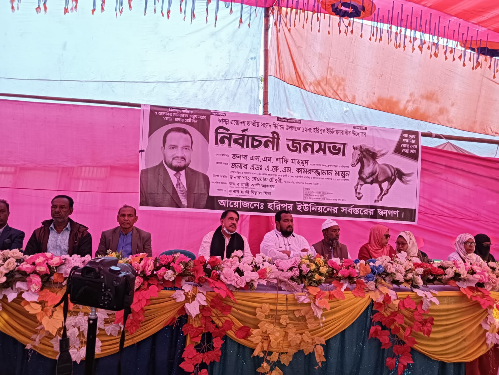 আসন্ন ত্রয়োদশ জাতীয় সংসদ নির্বাচনকে সামনে রেখে ব্রাহ্মণবাড়িয়া জেলার নাসিরনগর উপজেলার হরিপুর ইউনিয়নের সর্বস্তরের জনগণের উদ্যোগে এক বিশাল নির্বাচনী জনসভা অনুষ্ঠিত হয়েছে।