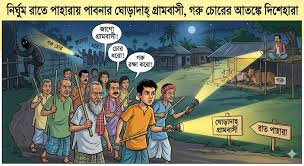চোর প্রতিরোধে এখন সন্ধ্যা নামলেই গ্রামের যুবক থেকে বৃদ্ধ সবাই হাতে লাঠি ও টর্চলাইট নিয়ে বেরিয়ে পড়ছেন। গ্রামজুড়ে চলছে ‘রাত্রি জাগরণ’। অলিগলি থেকে শুরু করে গুরুত্বপূর্ণ মোড়—সবখানেই টর্চের আলোয় জেগে থাকছে গ্রাম।
