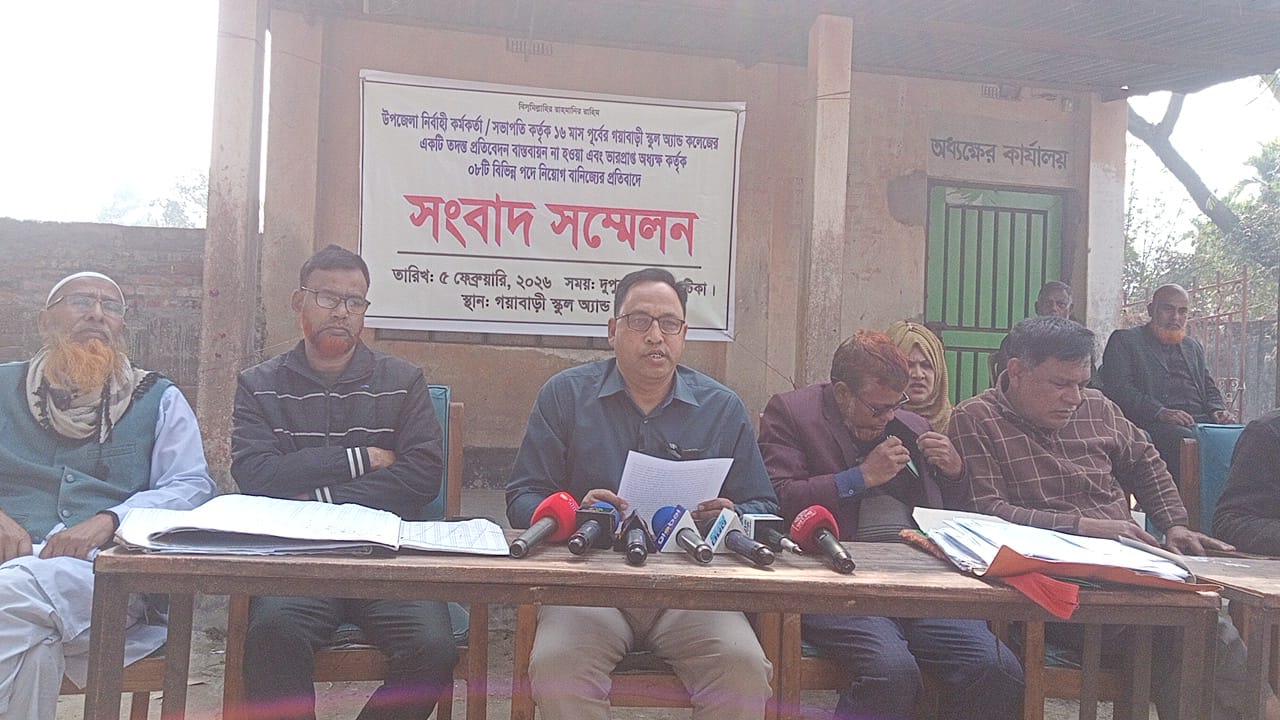 নীলফামারীর ডিমলা উপজেলার গয়াবাড়ী স্কুল অ্যান্ড কলেজের ভারপ্রাপ্ত অধ্যক্ষের বিরুদ্ধে অনিয়ম ও গোপনে নিয়োগ দেওয়ার অভিযোগ তুলে শিক্ষক, কর্মচারী ও স্থানীয়রা বৃহস্পতিবার সংবাদ সম্মেলন করেছেন।