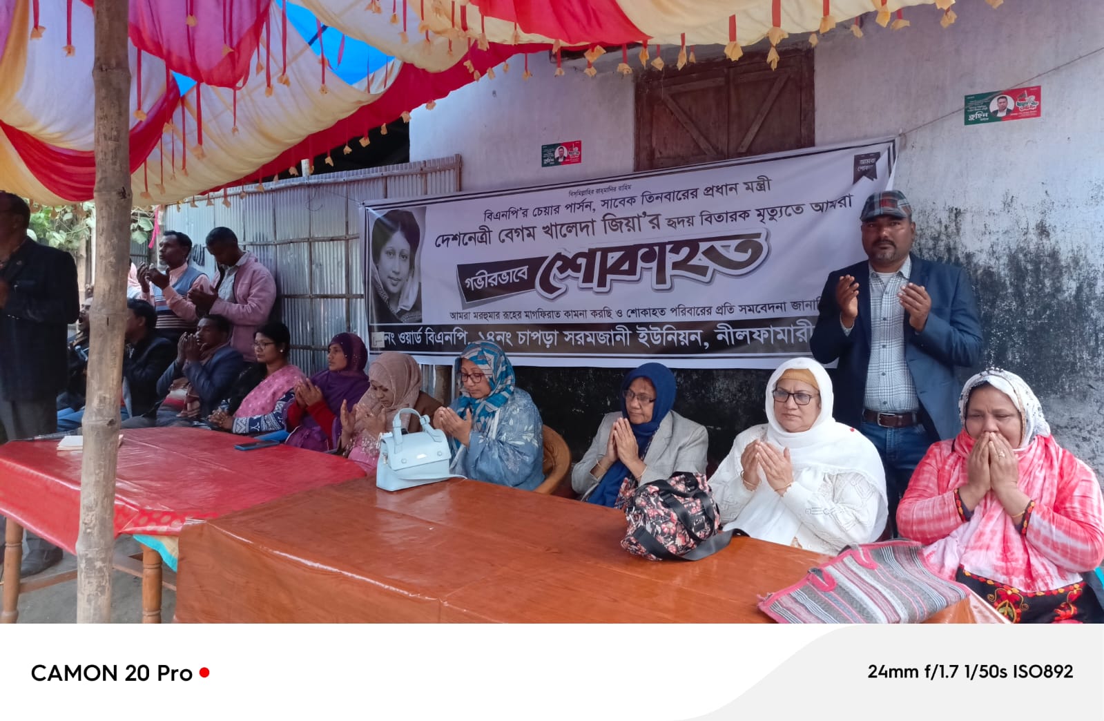 নীলফামারীতে বাংলাদেশ জাতীয়তাবাদী মহিলা দল নীলফামারী জেলা শাখার উদ্যোগে বিএনপি চেয়ারপারসন বেগম খালেদা জিয়ার রুহের মাগফিরাত কামনায় দোয়া মাহফিল অনুষ্ঠিত হয়েছে। মঙ্গলবার (২০ জানুয়ারি) বিকেলে জেলার চাপড়া সরমজানি ইউনিয়নে এ দোয়া মাহফিল অনুষ্ঠিত হয়।
