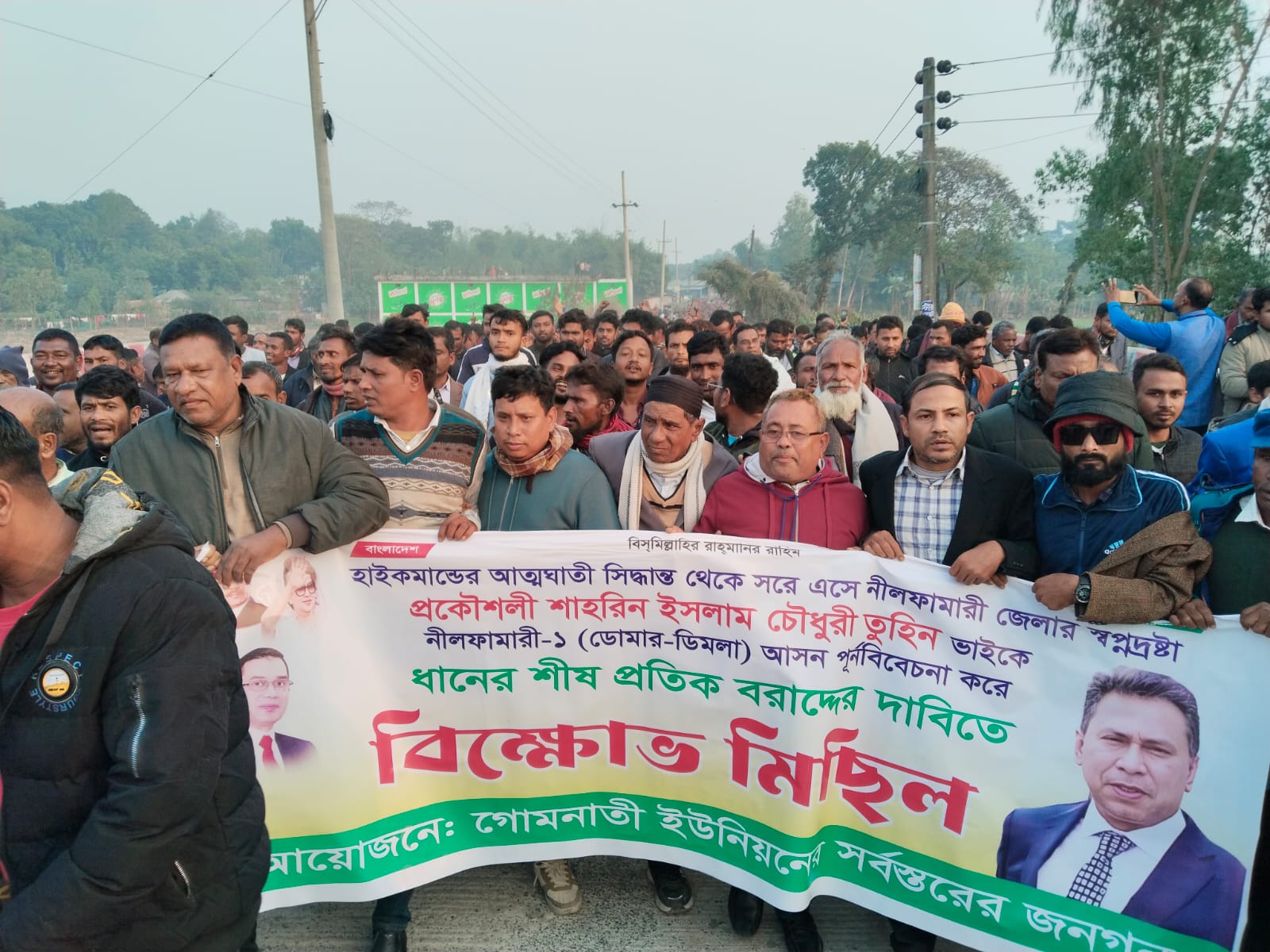 আসন্ন ত্রয়োদশ জাতীয় সংসদ নির্বাচনে নীলফামারী-০১ (ডোমার-ডিমলা) আসনে জোটের প্রার্থী বাদ দিয়ে বিএনপি চেয়ারপারসন বেগম খালেদা জিয়ার ভাগ্নে প্রকৌশলী শাহরিন ইসলাম চৌধুরী তুহিনকে প্রার্থী ঘোষণার দাবীতে নীলফামারীর ডোমারে সড়ক অবরোধ করে বিক্ষোভ মিছিল অনুষ্ঠিত হয়েছে।