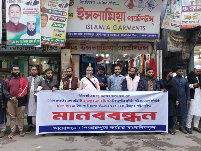 পিরোজপুরে কর্মরত সাংবাদিকবৃন্দের আয়োজনে অনুষ্ঠিত মানববন্ধনে স্থানীয় সাংবাদিক, মিডিয়াকর্মীসহ বিভিন্ন শ্রেণি-পেশার মানুষ অংশ নেন।