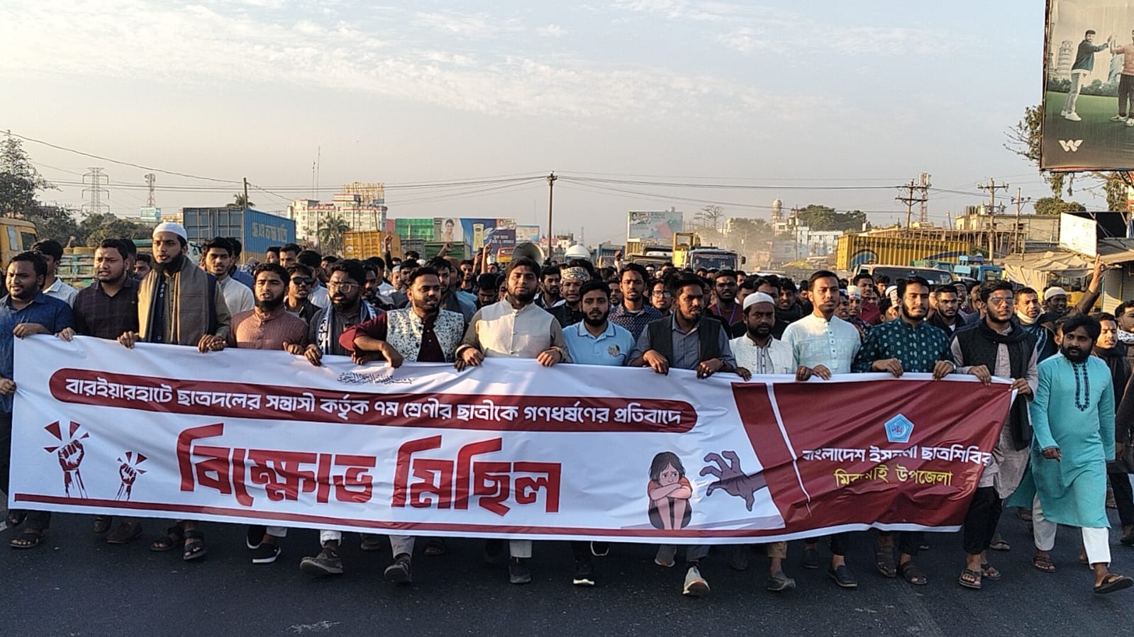 মিরসরাইয়ে সপ্তম শ্রেণির এক ছাত্রীকে সংঘবদ্ধ ধর্ষণের অভিযোগের প্রতিবাদে বিক্ষোভ মিছিল ও প্রতিবাদ সভা অনুষ্ঠিত হয়েছে। মঙ্গলবার (৩ ফেব্রুয়ারি) বিকেল ৫টার দিকে ঢাকা–চট্টগ্রাম মহাসড়কের বারইয়ারহাট পৌর সদরে এ কর্মসূচি পালন করা হয়।