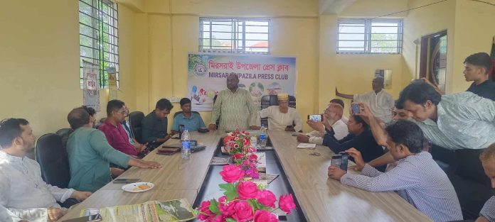 ” সাম্প্রতিক সময়ে গণমাধ্যমকর্মীদের ওপর হামলা ও অশালীন আচরণের নিন্দা জানিয়ে তিনি বলেন, “যে কেউ সাংবাদিকদের টার্গেট করলে জনগণকে সঙ্গে নিয়ে তার বিরুদ্ধে তীব্র প্রতিবাদ গড়ে তোলা হবে এবং প্রয়োজনীয় ব্যবস্থা নেয়া হবে। আমি সে আন্দোলনে সাংবাদিকদের পাশে থাকবো।” সভায় আরও উপস্থিত ছিলেন— জামায়াতে ইসলামী মিরসরাই উপজেলা সভাপতি মাস্টার নুরুল কবির, ব্ল্যাক আই সম্পাদক আবু সুফিয়ান চৌধুরী, উপজেলা প্রেসক্লাবের সহ-সভাপতি রাজিব মজুমদার, সাবেক সাধারন সম্পাদক ও নির্বাহী সদস্য নাছির উদ্দীন, যুগ্ম সম্পাদক বাবলু দে ও ইমাম হোসেন, সাংগঠনিক সম্পাদক দিদারুল আলম, অর্থ সম্পাদক কামরুল ইসলাম, দপ্তর সম্পাদক আবদুল মান্নান রানা, তথ্য প্রযুক্তি সম্পাদক জাবেদ হোসেন, সদস্য- এমদাদ হোসেন, রবি করিমসহ প্রেসক্লাবের অন্যান্য সদস্যবৃন্দ।