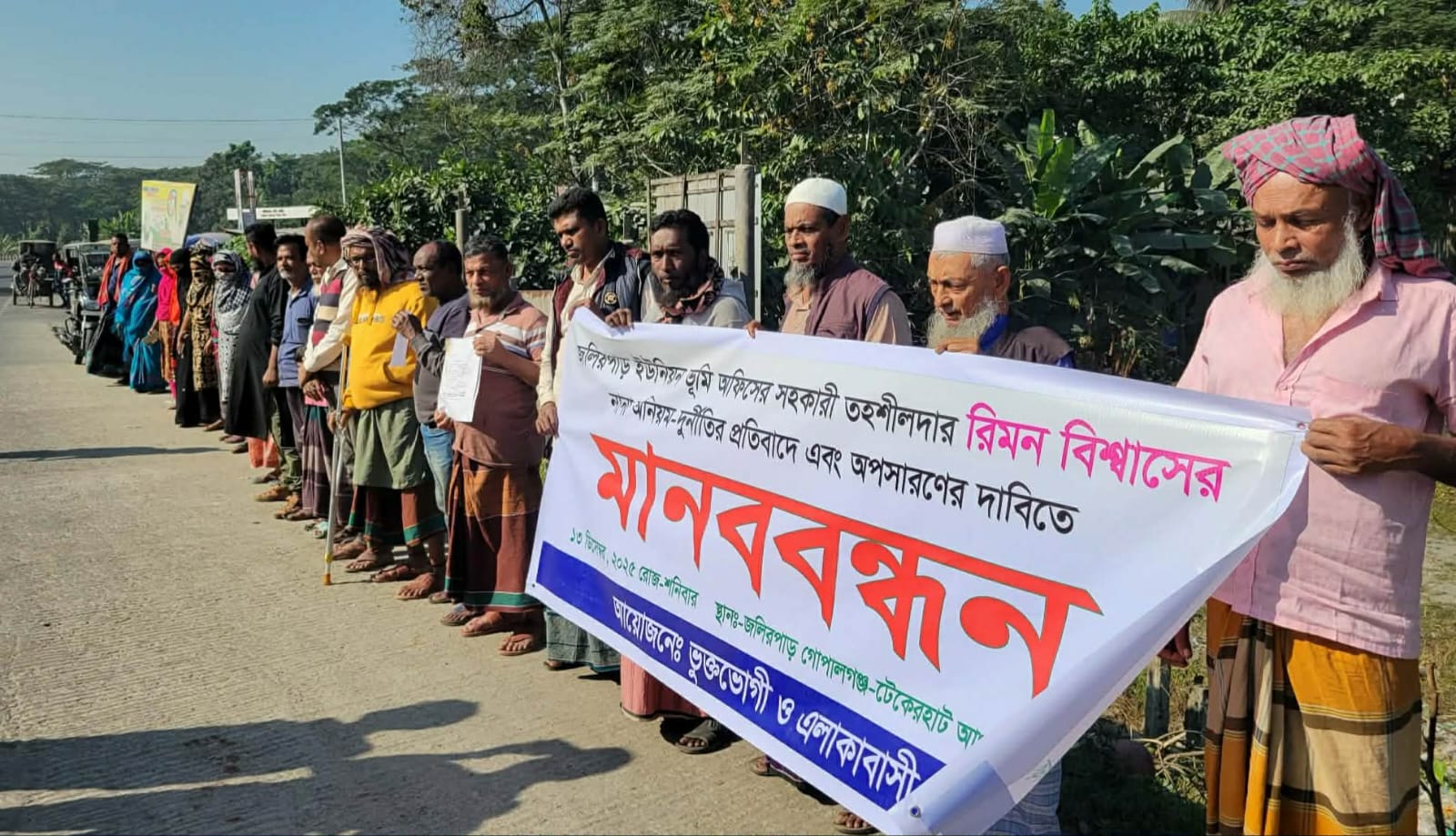 মানববন্ধনে উপ-সহকারী ভূমি কর্মকর্তা রিমন বিশ্বাসকে অপসারণ করে তাঁর বিরুদ্ধে দ্রুত আইনি ব্যবস্থা নিতে প্রশাসনের নিকট জোর দাবি জানান এলাকাবাসী।