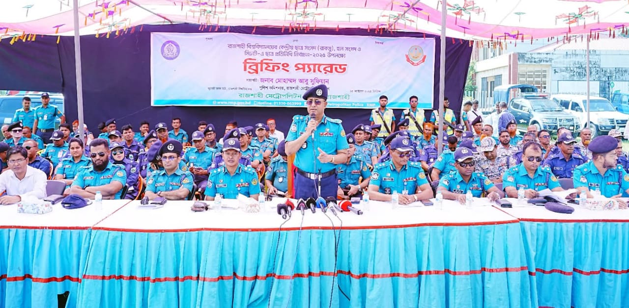রাজশাহী বিশ্ববিদ্যালয়ের কেন্দ্রীয় ছাত্র সংসদ (রাকসু), হল সংসদ ও সিনেট-এ ছাত্র প্রতিনিধি নির্বাচন-২০২৫ উপলক্ষ্যে রাজশাহী মেট্রোপলিটন পুলিশের বিশেষ ব্রিফিং প্যারেড অনুষ্ঠিত হয়েছে।