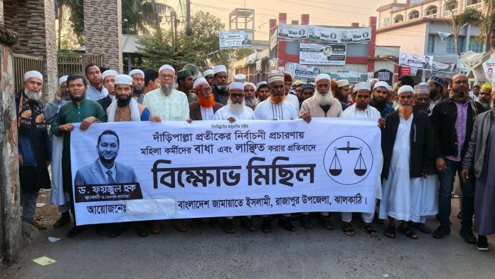 রাজাপুরে নির্বাচনী প্রচারণায় মহিলা কর্মীদের বাধা প্রদান ও লাঞ্ছনার প্রতিবাদে জামায়াতের বিক্ষোভ মিছিল