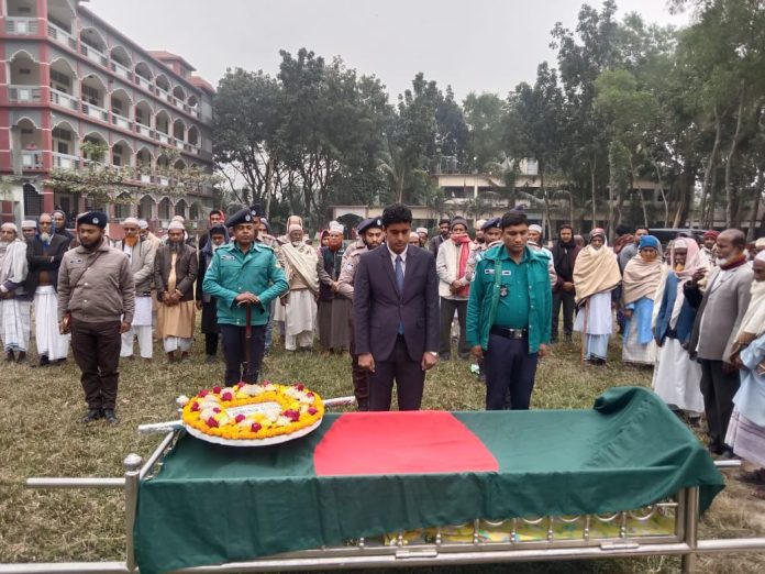 রাষ্ট্রের পক্ষে গার্ড গ্রহণ করেন গাজীপুর সহকারী কমিশনার (ভূমি) ও নির্বাহী ম্যাজিস্ট্রেট নূর নাহিন নিশাদ, এবং মরদেহে পুষ্পমাল্য অর্পণ করা হয়। পূবাইল থানা পুলিশের একটি দল গার্ড প্রদানে অংশগ্রহণ করে এবং বিউগলে করুন সুর বাজানো হয়। এক মিনিট নীরবতা পালন শেষে জানাজা নামাজ অনুষ্ঠিত হয়।