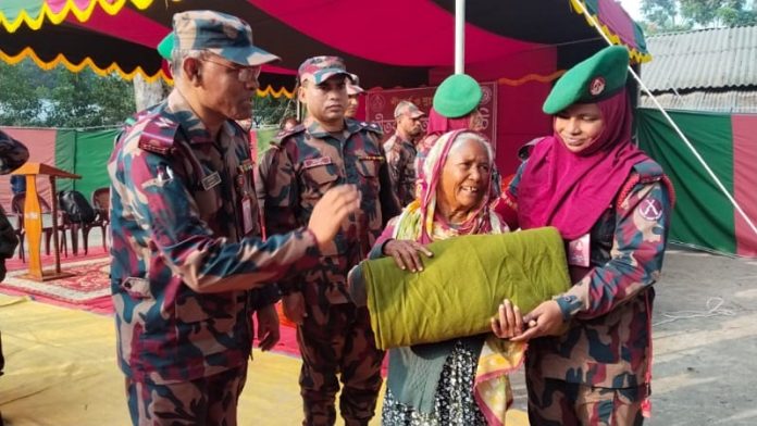 চলমান শৈত্যপ্রবাহে নীলফামারীর চিলাহাটি সীমান্তবর্তী এলাকার শীতার্ত ও দুস্থ মানুষের পাশে দাঁড়িয়েছে বর্ডার গার্ড বাংলাদেশ (বিজিবি)। মঙ্গলবার (৬ জানুয়ারি) নীলফামারী ব্যাটালিয়ন (৫৬ বিজিবি)-এর উদ্যোগে ডোমার উপজেলার ভোগডাবুড়ি ইউনিয়নের আব্দুর রউফ সরকারি প্রাথমিক বিদ্যালয় মাঠে ২৫০ জন অসহায় মানুষের মাঝে কম্বল বিতরণ করা হয়।