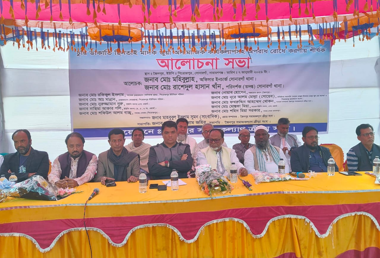 নারায়ণগঞ্জের সোনারগাঁ উপজেলার পিরোজপুর ইউনিয়নের জৈনপুর এলাকায় চুরি, ডাকাতি, চাঁদাবাজি ও ছিনতাই প্রতিরোধে ঐক্যবদ্ধ হওয়ার ঘোষণা দিয়েছে জৈনপুর সমাজকল্যাণ ক্রীড়া সংঘ।
