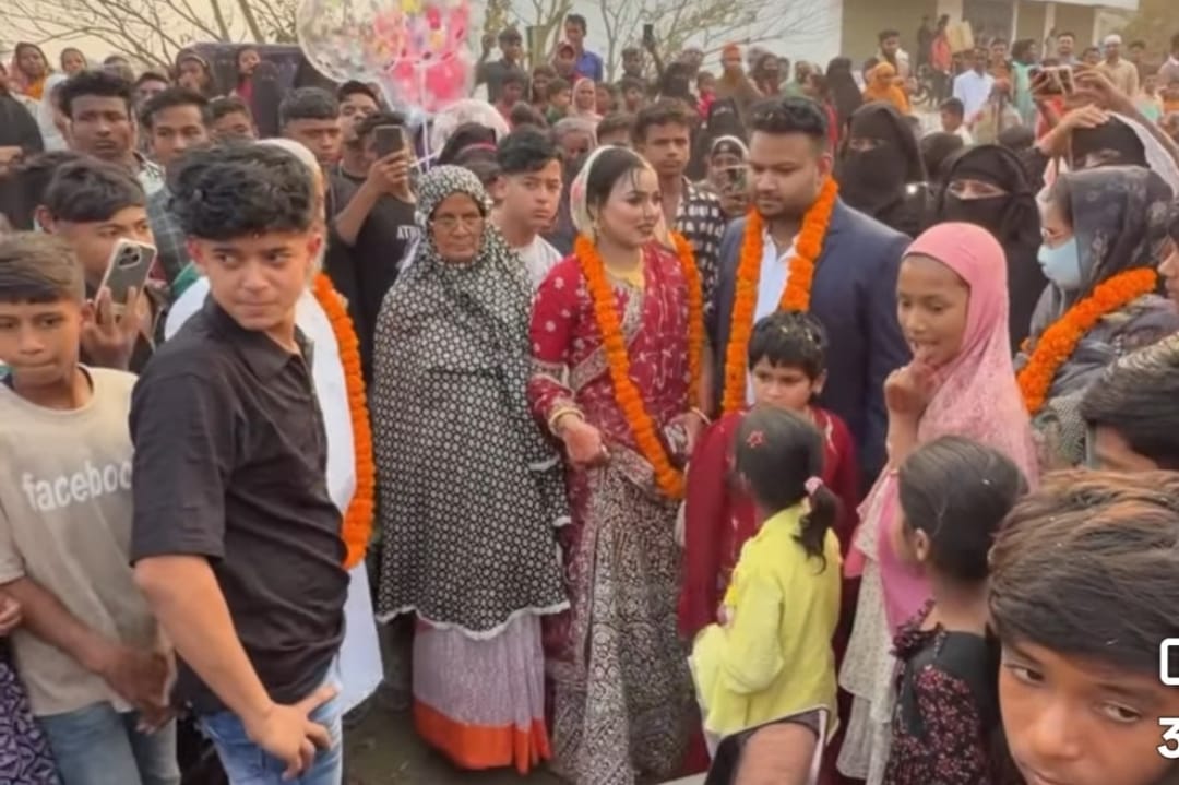 হেলিকপ্টার অবতরণের সঙ্গে সঙ্গেই কলেজ মাঠে উৎসুক মানুষের ভিড় জমে যায়। পুরো এলাকা উৎসবমুখর হয়ে ওঠে। শিশু-কিশোর থেকে শুরু করে নারী ও বৃদ্ধ—সবাই মোবাইল ফোনে ভিডিও ধারণ ও সেলফি তুলতে ব্যস্ত হয়ে পড়েন। পরে বর-কনে পক্ষের স্বজনরা ফুল দিয়ে নবদম্পতিকে বরণ করে নেন।