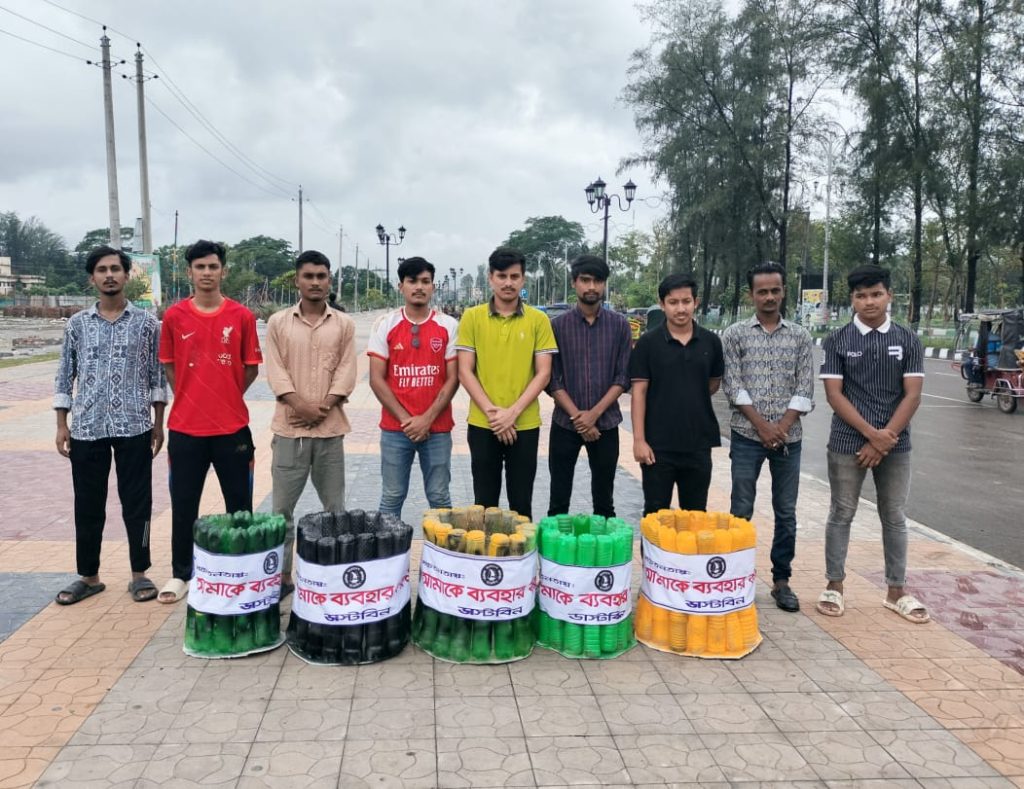 প্লাস্টিকের বর্জ্য দিয়ে ভরে গেলে বোতল আকৃতির এই ডাস্টবিন গুলো পটুয়াখালী পৌরসভার বর্জ্য ব্যবস্থাপনা বিভাগের কর্মীরা পরিষ্কার করে দিচ্ছেন।