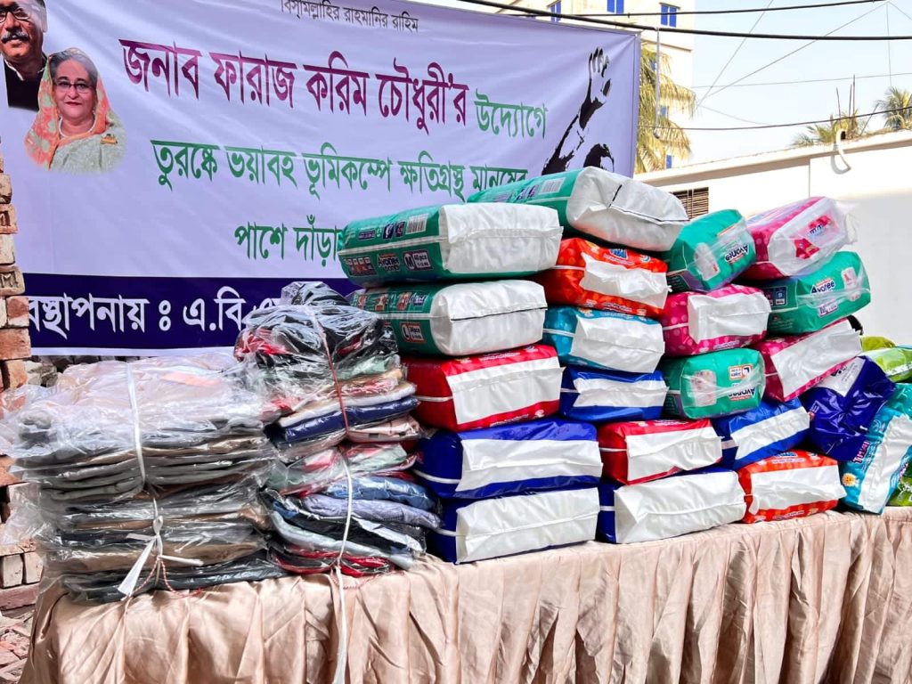 আজ চট্টগ্রামের আগ্রাবাদস্থ সিঙ্গাপুর-ব্যাংকক মার্কেটের বিপরীতে অবস্থিত এস.এফ টাওয়ারের সামনে অস্থায়ী কালেকশন বুথ স্থাপন করেন তিনি। সেখানে ফারাজ করিম চৌধুরীর আহবানে অর্ধশত স্বেচ্ছাসেবী কম্বল, জ্যাকেট, সোয়েটার, স্যানিটারি ন্যাপকিন, মৌজা, বেবি ডায়াপার, আন্ডার গার্মেন্টস থেকে শুরু করে বিভিন্ন ধরনের সামগ্রী পাঠানোর জন্য প্যাকেটজাত করে প্রস্তুত করছেন। এসব সামগ্রী বৃহস্পতিবার রাত ৮ টার মধ্যে ট্রাকে ভর্তি করে ঢাকায় অবস্থিত তুরস্ক দূতাবাসের উদ্দেশ্যে রওয়ানা দিবে।