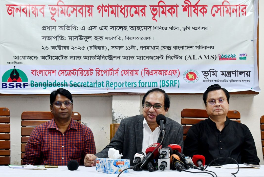 রোববার (২৬ অক্টোবর) সচিবালয়ে গণমাধ্যম কেন্দ্রে ‘জনবান্ধব ভূমিসেবায় গণমাধ্যমের ভূমিকা’ শীর্ষক সেমিনারে তিনি এ মন্তব্য করেন। বাংলাদেশ সেক্রেটারিয়েট রিপোর্টার্স ফোরাম (বিএসআরএফ) এর উদ্যোগে এবং ভূমি মন্ত্রণালয়ের অটোমেটেড ল্যান্ড অ্যাডমিনিস্ট্রেশন অ্যান্ড ম্যানেজমেন্ট সিস্টেম (ALAMS) আয়োজনে সেমিনারটি অনুষ্ঠিত হয়।