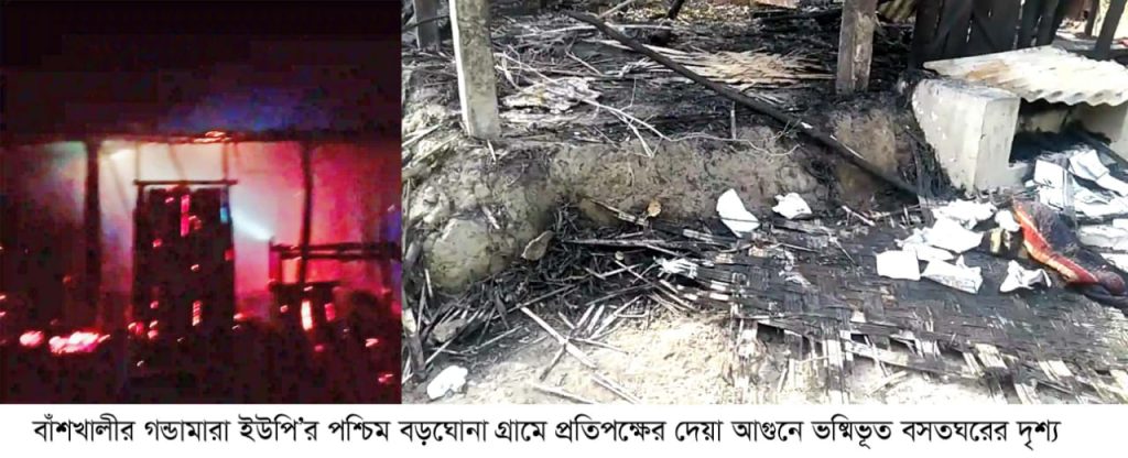 চট্টগ্রামের বাঁশখালীর বড়ঘোনা এলাকায় প্রতিপক্ষের দেয়া আগুনে পুড়েছে বসতঘর।