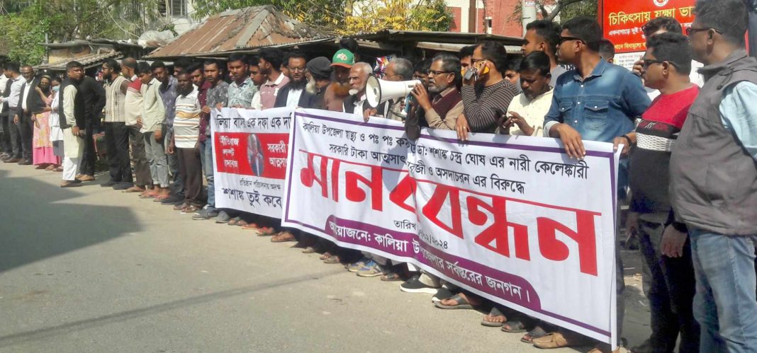 নড়াইলের কালিয়া উপজেলা স্বাস্থ্য ও পরিবার পরিকল্পনা কর্মকর্তা ডাক্তার শশাঙ্ক চন্দ্র ঘোষের অপসারণ দাবিতে মানববন্ধন অনুষ্ঠিত হয়েছে।
