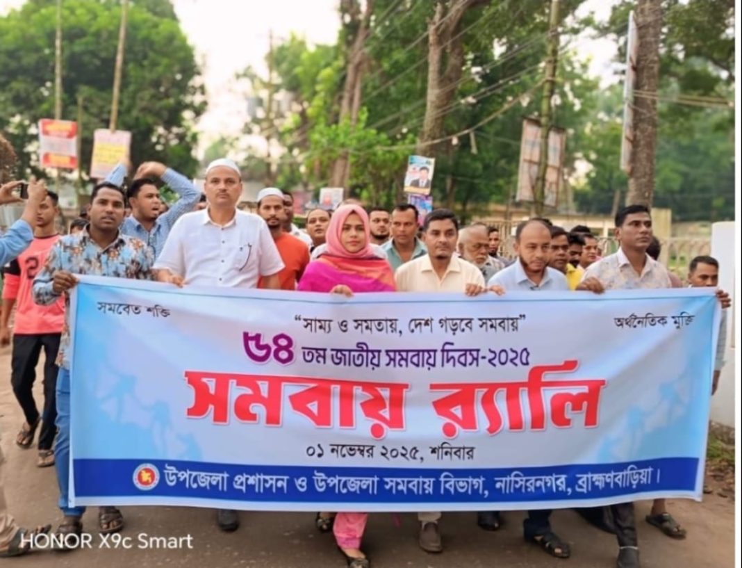 “সাম্য ও সমতায় দেশ গড়বো সমবায়” শ্লোগানকে সামনে রেখে ব্রাহ্মণবাড়িয়ার নাসির নগর উপজেলায় পালিত হয়েছে ৫৪তম জাতীয় সমবায় দিবস। শনিবার (১ নভেম্বর ২০২৫) সকাল ১০টায় নাসির নগর সমবায় অফিস প্রাঙ্গণে পতাকা উত্তোলনের মধ্য দিয়ে দিবসটির আনুষ্ঠানিক সূচনা করা হয়।