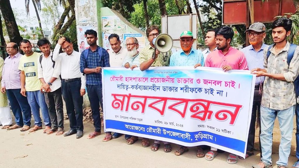 শরীয়তপুর থেকে কুড়িগ্রামের রৌমারী উপজেলা স্বাস্থ্য কমপ্লেক্সে এক চিকিৎসককে বদলির প্রতিবাদে মানববন্ধন অনুষ্ঠিত হয়েছে।