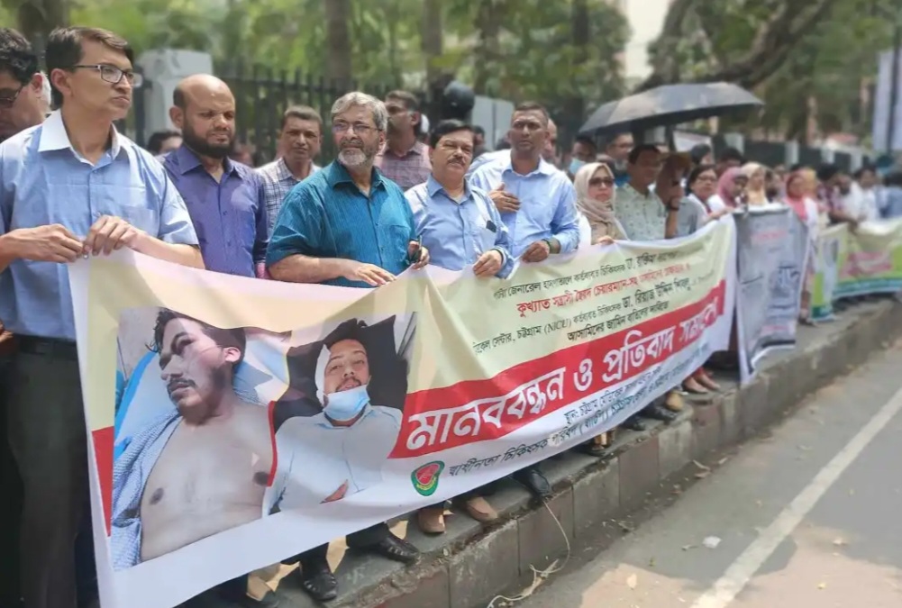 বৃহস্পতিবার (১৮ এপ্রিল) দুপুর সাড়ে ১২টায় চট্টগ্রাম মেডিক্যাল কলেজ (চমেক) হাসপাতালের সামনে বাংলাদেশ মেডিক্যাল অ্যাসোসিয়েশনের (বিএমএ) চট্টগ্রাম শাখার উদ্যোগে চিকিৎসকদের বিভিন্ন সংগঠনের অংশগ্রহণে আয়োজিত মানববন্ধনে বক্তারা এসব কথা বলেন।