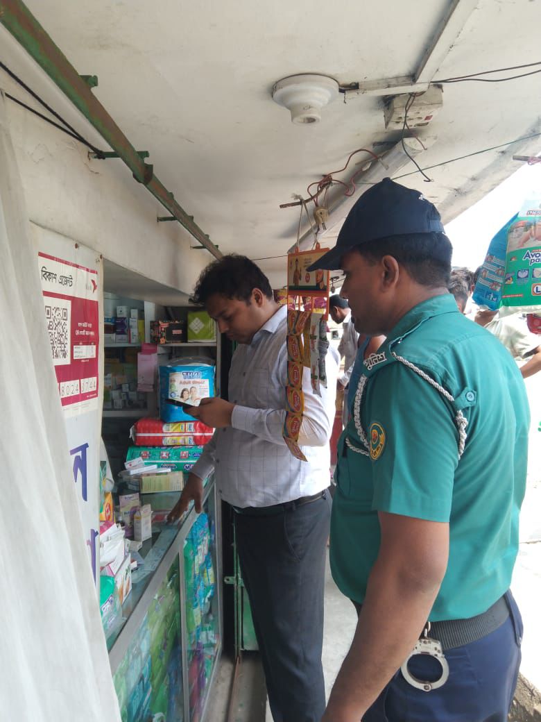 এই সময় মেয়াদ উর্ত্তীণ ঔষধ রাখা এবং ড্রাগ লাইসেন্স এর মেয়াদ না থাকায় মেসার্স লাল গোলাপ মেডিসিন কর্ণার নামক একটি ঔষধের দোকানের স্বত্বাধিকারীকে ভোক্তা অধিকার ও সংরক্ষণ আইন ২০০৯ এর ৫১ ধারায় ৫০০০ টাকা, মূল্য তালিকা না থাকায় নমেয়া ও তৈয়ব স্টোর নামক দুটি মুদির দোকানের স্বত্বাধিকারীকে ভোক্তা অধিকার ও সংরক্ষণ আইন ২০০৯ এর ৩৯ ধরায় মোট ৮০০০ টাকা জরিমানা করা হয়। এছাড়াও কোনো প্রকার ডকুমেন্টস না থাকা ও রাস্তার মাঝে আইন অমান্য করে পার্কিং করায় একটি সিএনজি অটোরিকশা কে ডাম্পিং এ পাঠানো হয়।