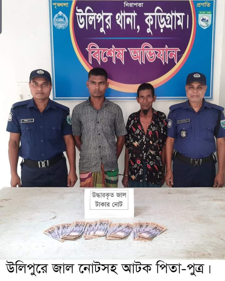 কুড়িগ্রামের উলিপুরে ৩৩ হাজার টাকার জাল নোটসহ পিতা-পুত্রকে আটক করেছে পুলিশ। ওই পিতা-পুত্র জাল টাকার নোট দিয়ে গরু ক্রয় করেছিলেন। আটকের ঘটনাটি ঘটেছে, পৌর শহরের গরুর হাট এলাকায়। আটক ব্যক্তিদের মঙ্গলবার (৪ জুন) আদালতের মাধ্যমে জেল হাজতে পাঠানো হয়েছে। উলিপুর থানার ওসি বিষয়টি নিশ্চিত করেছেন।