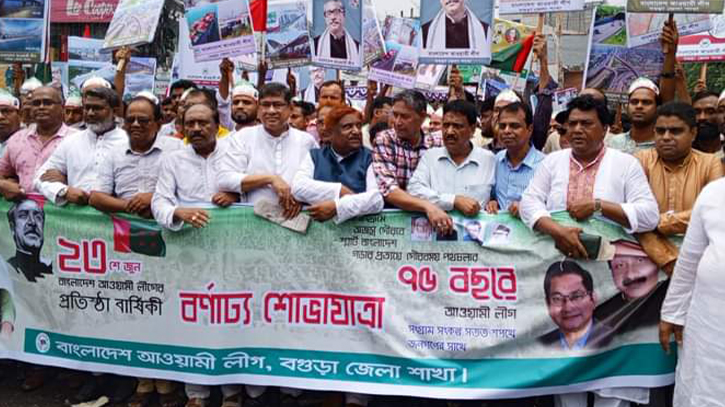বগুড়া জেলা আওয়ামীলীগের উদ্যোগে নানা আয়োজনে রোববার (২৩ জুন) বাংলাদেশ আওয়ামীলীগের ৭৫তম প্রতিষ্ঠা বার্ষিকী (প্লাটিনাম জয়ন্তি) পালিত হয়েছে। সকাল ৮ টায় দলীয় কার্যালয়ে জাতীয় ও দলীয় পতাকা উত্তোলন করা হয়। এরপর দলীয় কার্যালয়ের সামনে রক্ষিত বঙ্গবন্ধু শেখ মুজিবুর রহমানের প্রতিকৃতিতে পুষ্পমাল্য অর্পন করেন দলের সভাপতি ও সাধারণ সম্পাদকসহ অসংখ্য নেতা কর্মীরা। বৃষ্টি কারনে বেলা ১২ টায় এক জমকালো বর্ণাঢ্য শোভাযাত্রা শহর প্রদক্ষিন করে।
