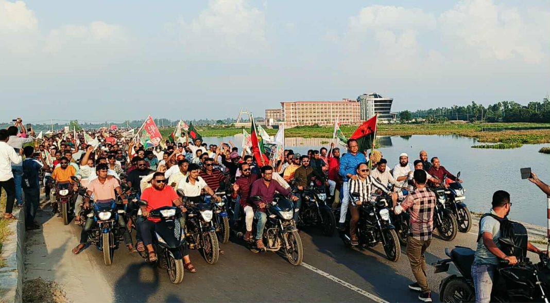 নাটোরের সিংড়ায় বিএনপির যুগ্ম আহ্বায়ক ও উপজেলা বিএনপির সাবেক সাধারণ সম্পাদক দাউদার মাহমুদের নেতৃত্বে হাজারো মোটরসাইকেল নিয়ে ব্যাপক প্রচারণা অনুষ্ঠিত হয়েছে। বৃহস্পতিবার (৬ নভেম্বর) বিকেল সাড়ে ৪টায় উপজেলা কোর্টমাঠ থেকে এই শোভাযাত্রা শুরু হয়।