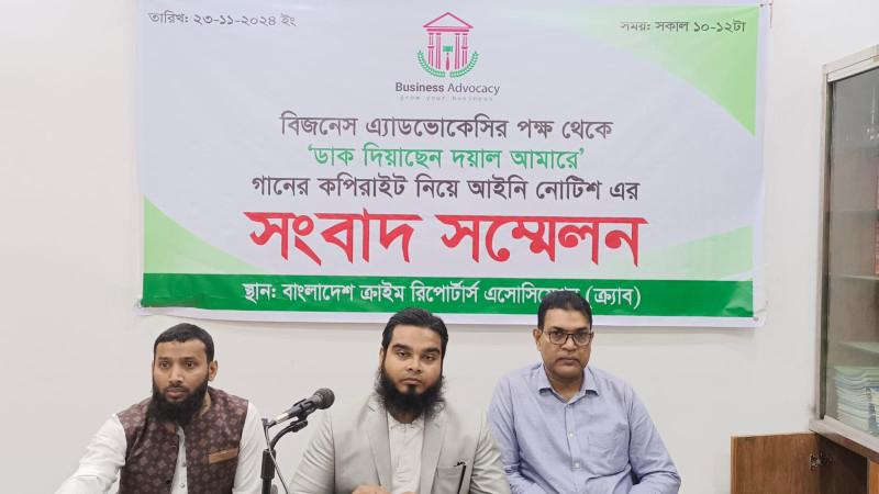 বহুল আলোচিত গান “ডাক দিয়াছেন দয়াল আমারে” গানের কপিরাইট ইস্যুকে কেন্দ্র করে একটি সংবাদ সম্মেলন অনুষ্ঠিত হয়েছে। শনিবার (২৩ নভেম্বর) সকালে বাংলাদেশ ক্রাইম রিপোর্টার এ্যাসোসিয়েশন (ক্র্যাব) এ এই সংবাদ সম্মেলন অনুষ্ঠিত হয়।